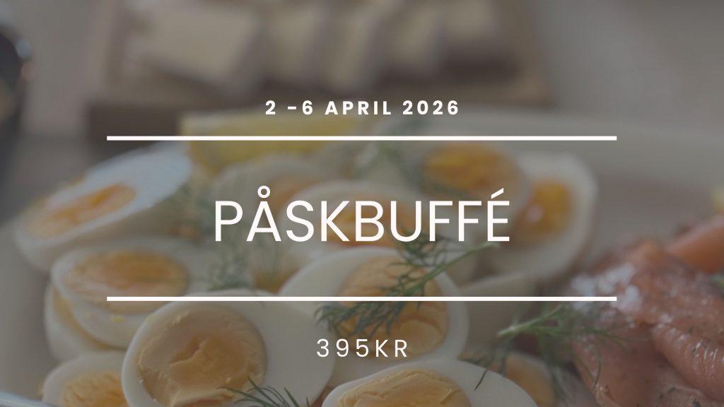Vi serverar påskbuffé från skärtorsdagen till annandag påsk med start klockan 12.00. En rejäl buffé med något för de allra flesta, bland annat sill, ägg & potatis, varmrökt lax, paj, sallader, snittar och hembakat bröd. På dessertbordet ställer vi fram 7 sorters kakor och kaffe. Allt är givetvis rökt, bakat, rört, vispat – ja tillagat på alla möjliga vis som brukligt här hos oss.