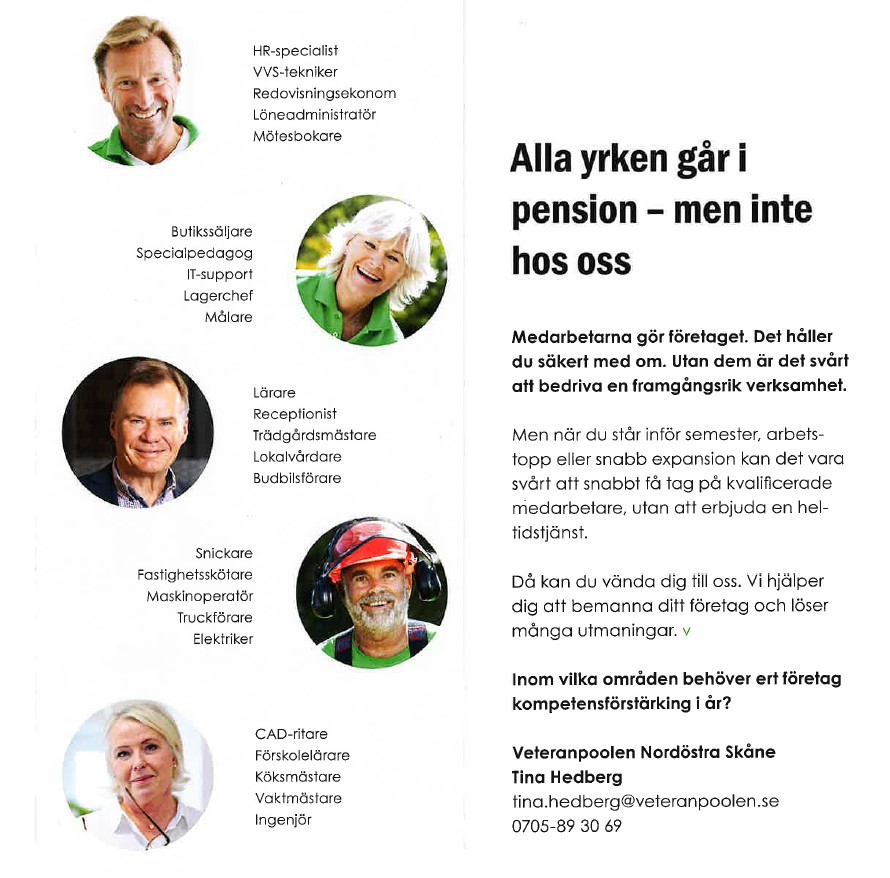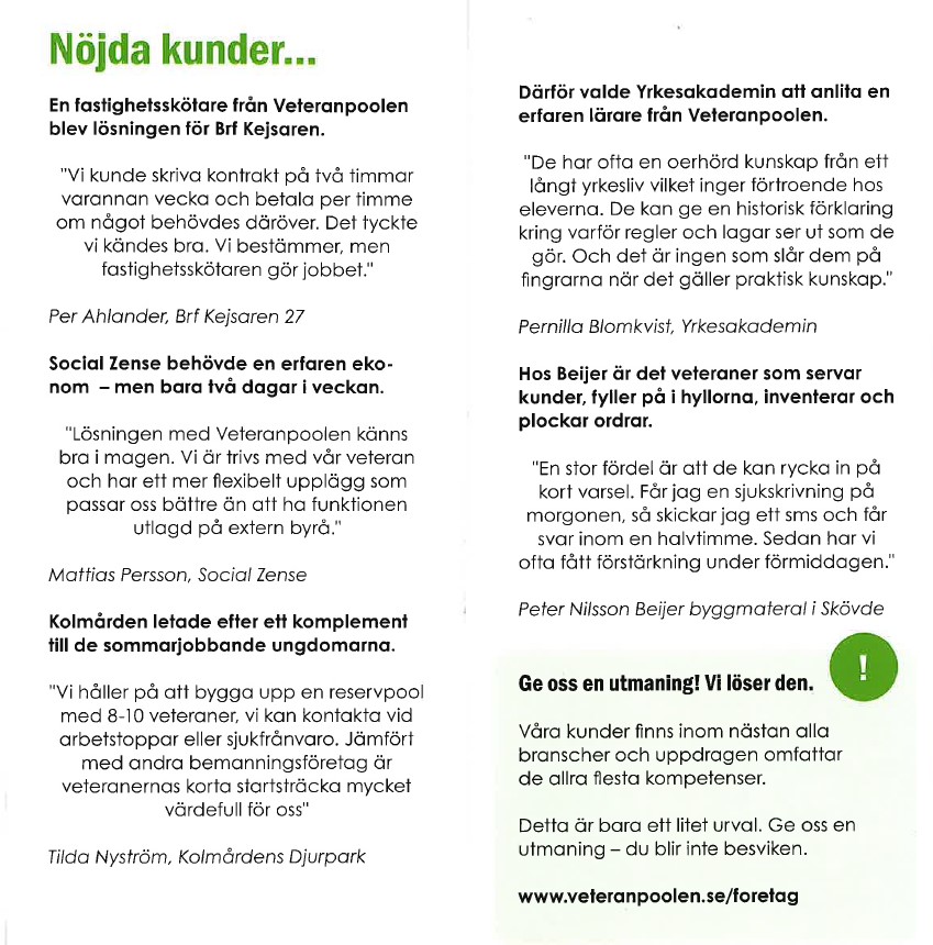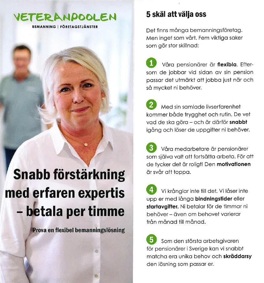 DÄ kan du vÀnda dig till oss pÄ Veteranpoolen. Vi hjÀlper dig att bemanna ditt företag och lösa mÄnga utmaningar. Hos oss fÄr du snabbt tillgÄng till bÄde erfarna och lojala medarbetare inom de flesta yrkesomrÄden. Helt utan att ni lÄser upp er i ett visst antal timmar. En snabb och flexibel lösning.