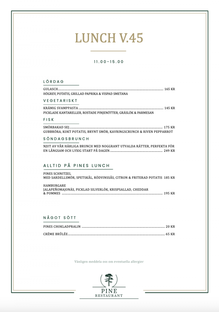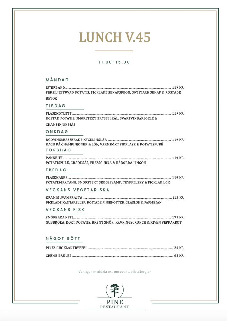 Dagens lunch på PINE (Kristianstad Golfklubb och Destination) må-sö vecka 45