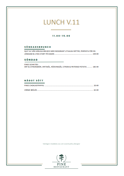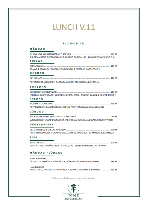 Dagens lunch på PINE (Kristianstad Golfklubb och Destination) må-sö vecka 11